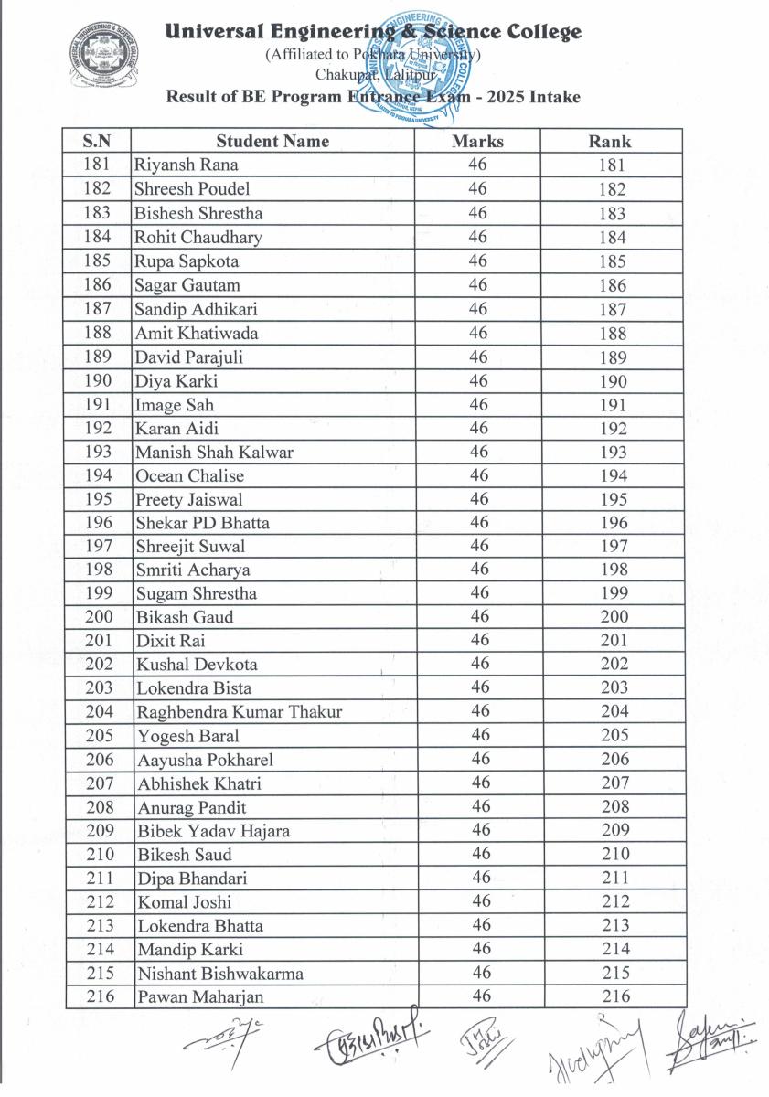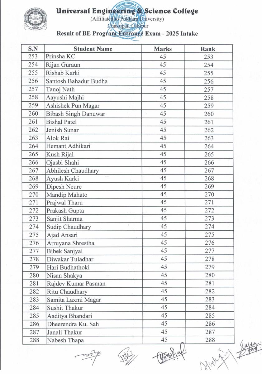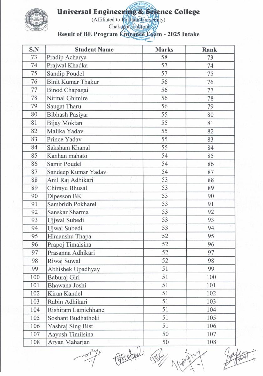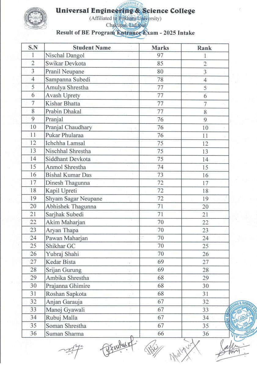 BE Programs Entrance Examination for 2025 Intake Result Published