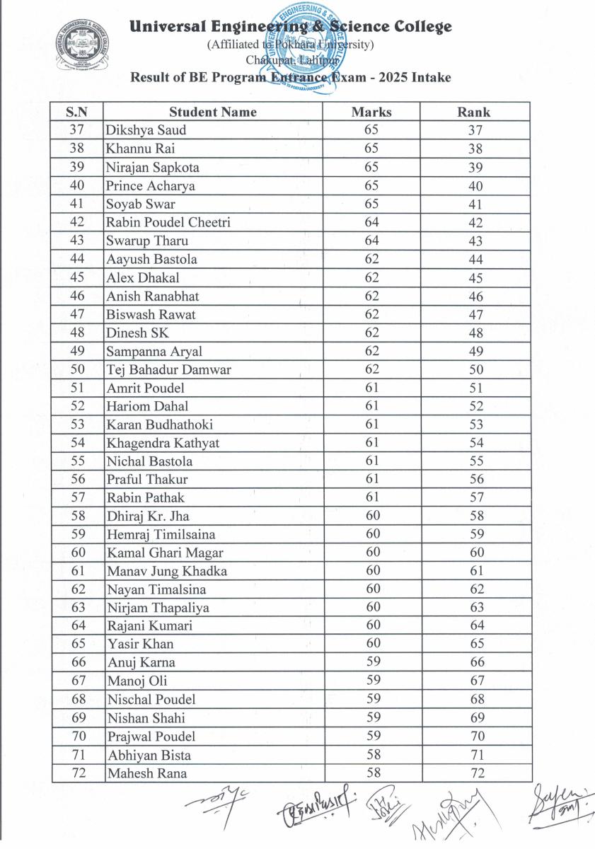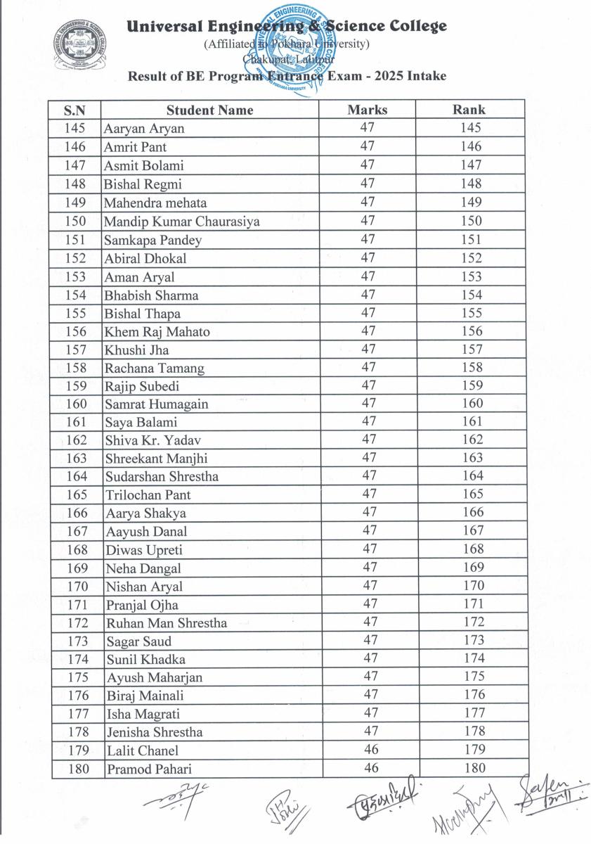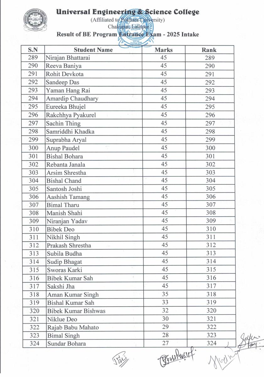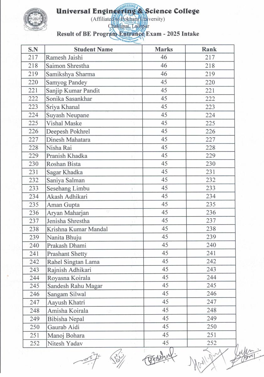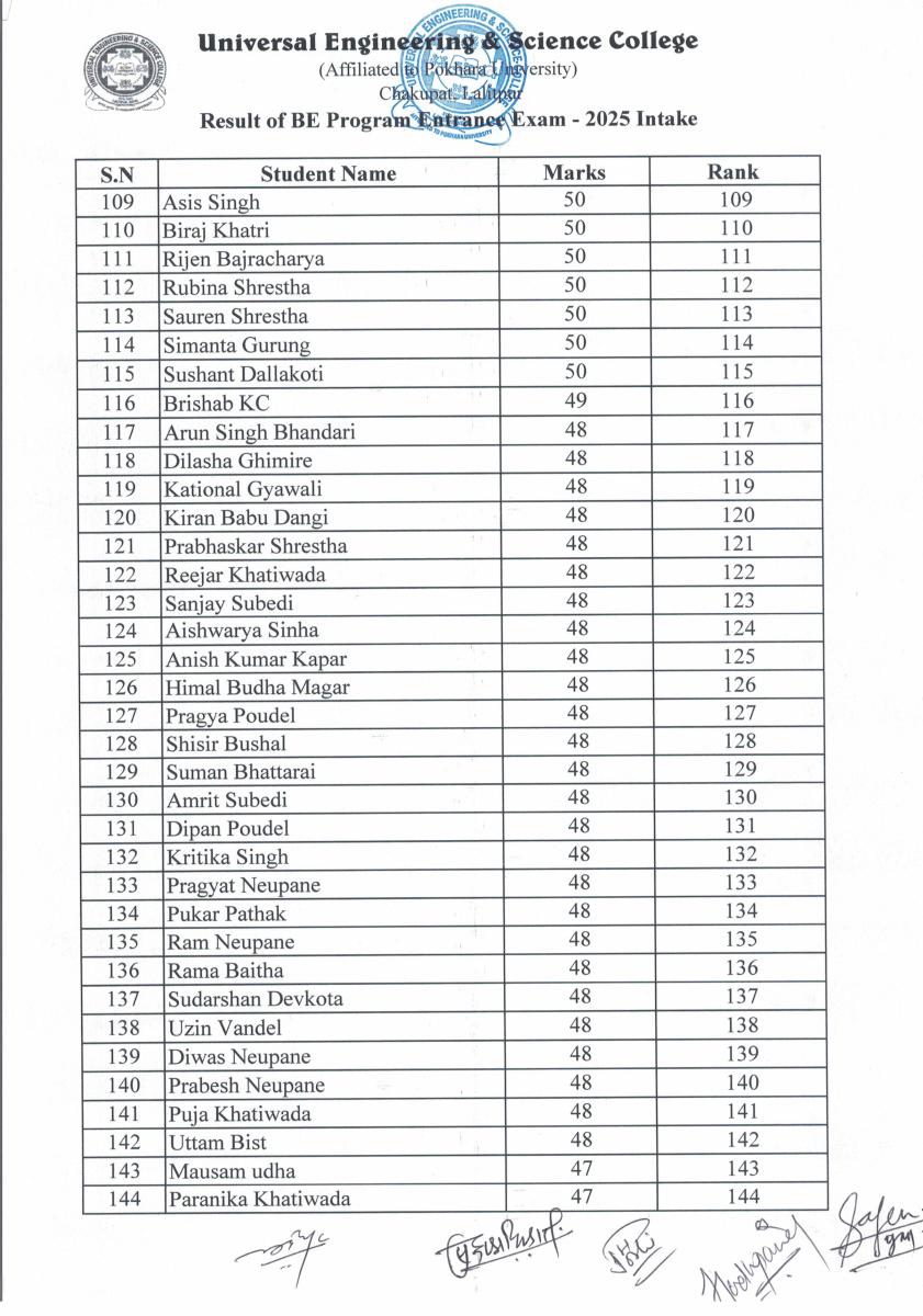 BE Programs Entrance Examination for 2025 Intake Result Published